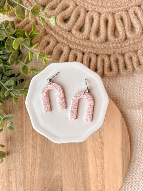 Get ready for spring with a touch of whimsy! Deco Arches feature a playful art deco print in a beautiful pale pink color. These simple yet feminine polymer clay earrings will add a unique and fun element to any outfit. Perfect for the quirky fashionista in you!